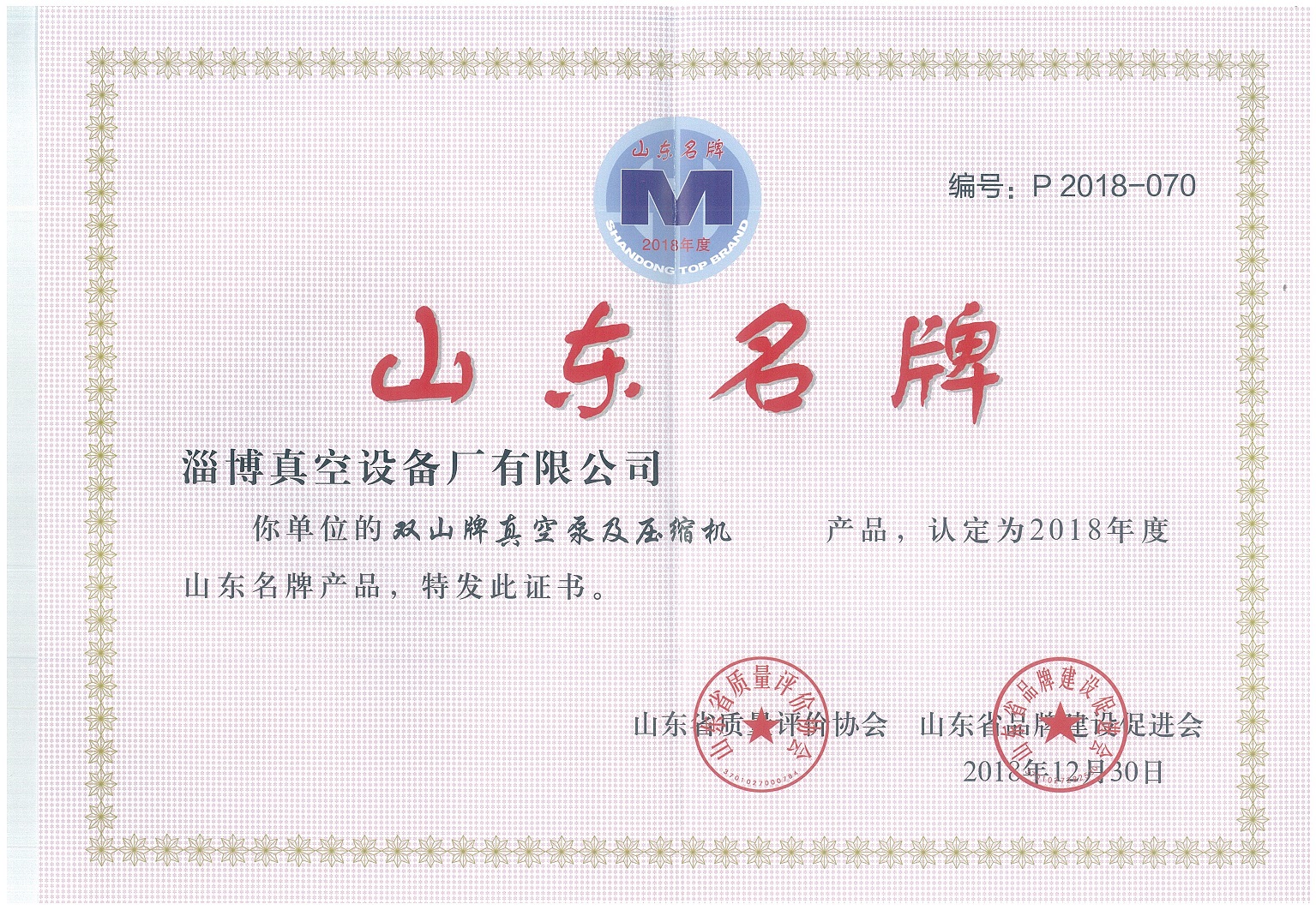公司生產(chǎn)的“雙山”牌真空泵被山東省質(zhì)量評(píng)價(jià)協(xié)會(huì)和山東省品牌建設(shè)促進(jìn)會(huì)認(rèn)定為山東名牌